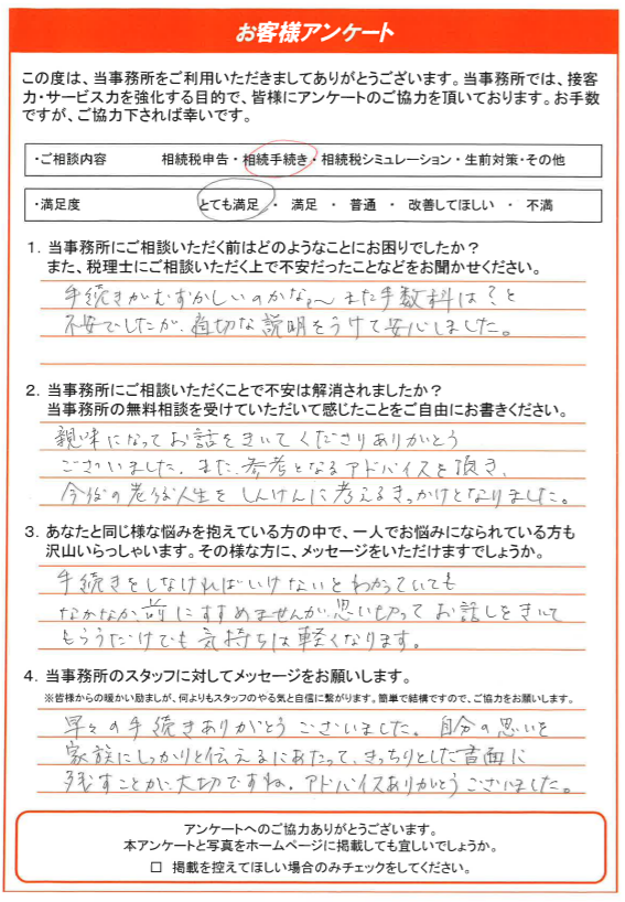 早々の手続きありがとうございました、自分の思いを家族にしっかりと伝えるにあたって、きっちりとした書面に残すことが大切ですね、アドバイスありがとうございました。