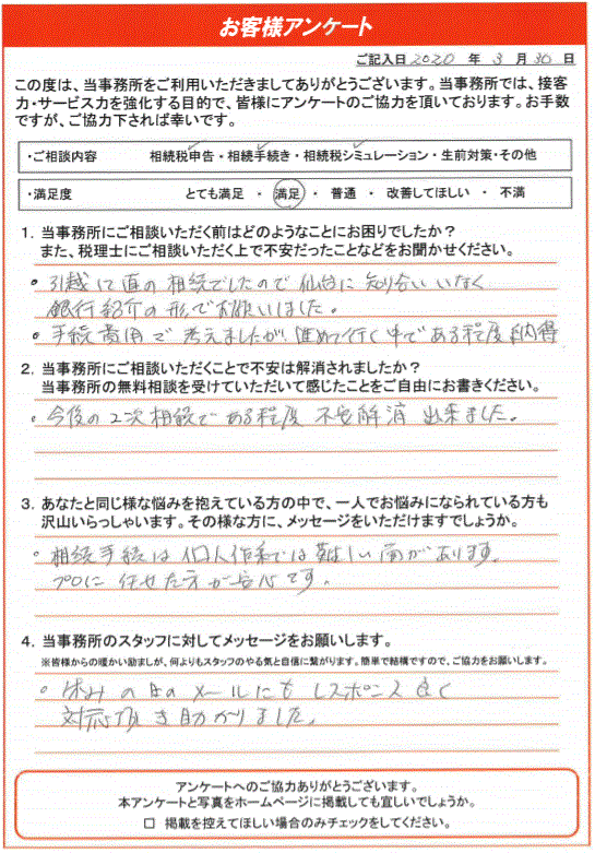 ・引っ越して直の相続でしたので仙台に知り合いはいなく銀行紹介の形でお願いしました。