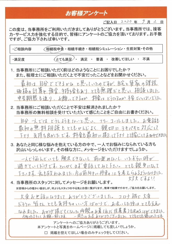 コロナ禍で大変だろうに皆さんとても気持ちのいい方ばかりで、お会いした後はとても元気になれました。おかげ様で亡くなった両親のお墓も決めることが出来ました。
