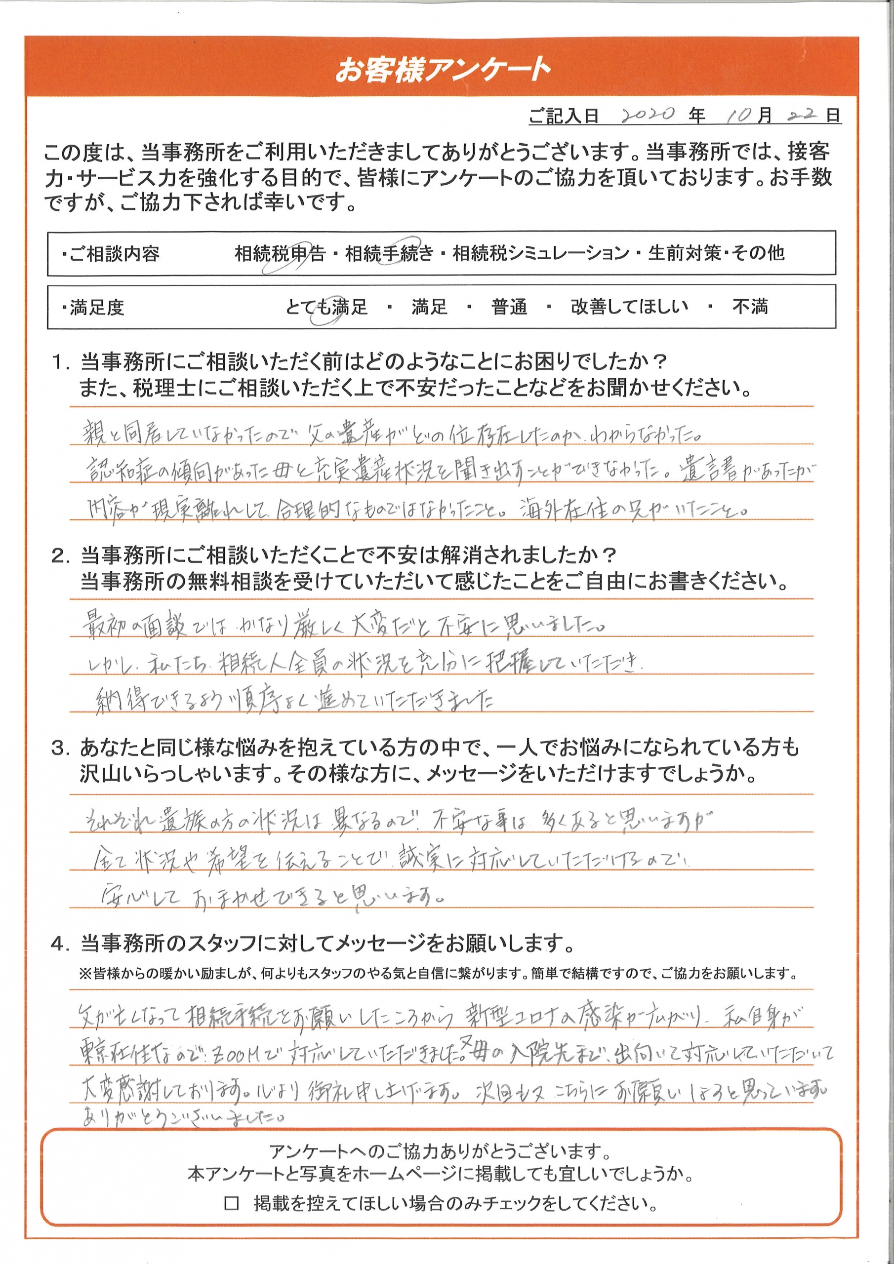 父が亡くなって相続手続きをお願いしたころから新型コロナの感染が広がり、私自身が東京在住なのでZoomで対応していただきました。又、母の入院先まで出向いて対応していただいて大変感謝しております。心より御礼申し上げます。次回も又こちらにお願いしようと思っています。ありがとうございました。