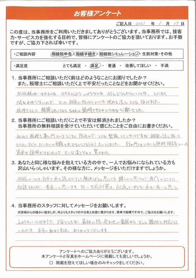 相続税がかかるのか、かかるとしたらいくらなのか、何をどうしたらいいのか、とにかく何もわからないので、どこに相談に行ったらいいか決める迄もとても悩みました。税理士さんに相談したいことをちゃんと説明できるかどうかも心配でした。