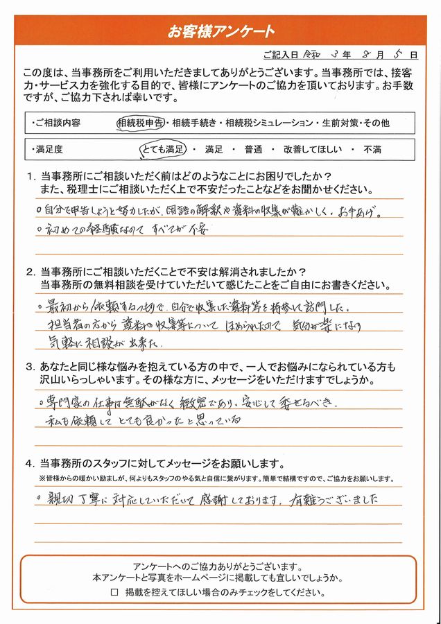 親切丁寧に対応していただいて感謝しております。ありがとうございました。