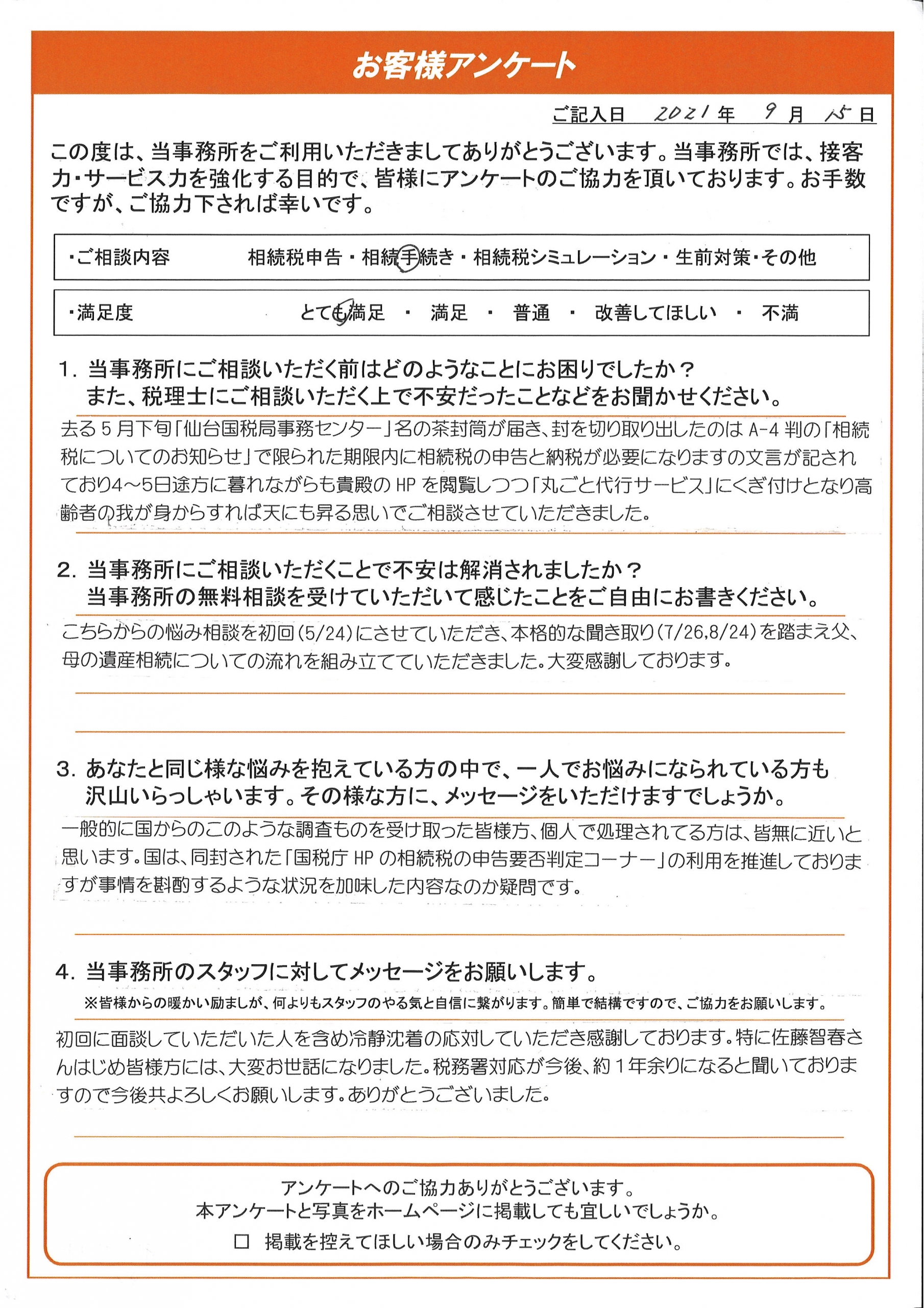 去る5月下旬「仙台国税局事務センター」名の茶封筒が届き、封を切り取り出したのはA-4判の「相続税についてのお知らせ」で限られた期限内に相続税の申告と納税が必要になるますの文言が記されており4~5日途方に暮れながらも貴殿のHPを閲覧しつつ「丸ごと代行サービス」にくぎ付けとなり高齢者の我が身からすれば天にも昇る思いでご相談させていただきました。