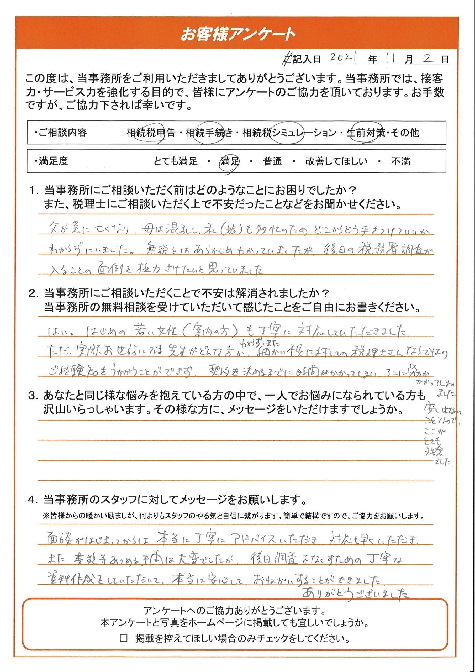 父が急に亡くなり、母は混乱し、私(娘)も多忙なためどこからどう手をつけていいかわからずにいました。無税とはあらかじめわかっていましたが、後日の税務署調査が入ることの面倒を極力さけたいと思っていました。