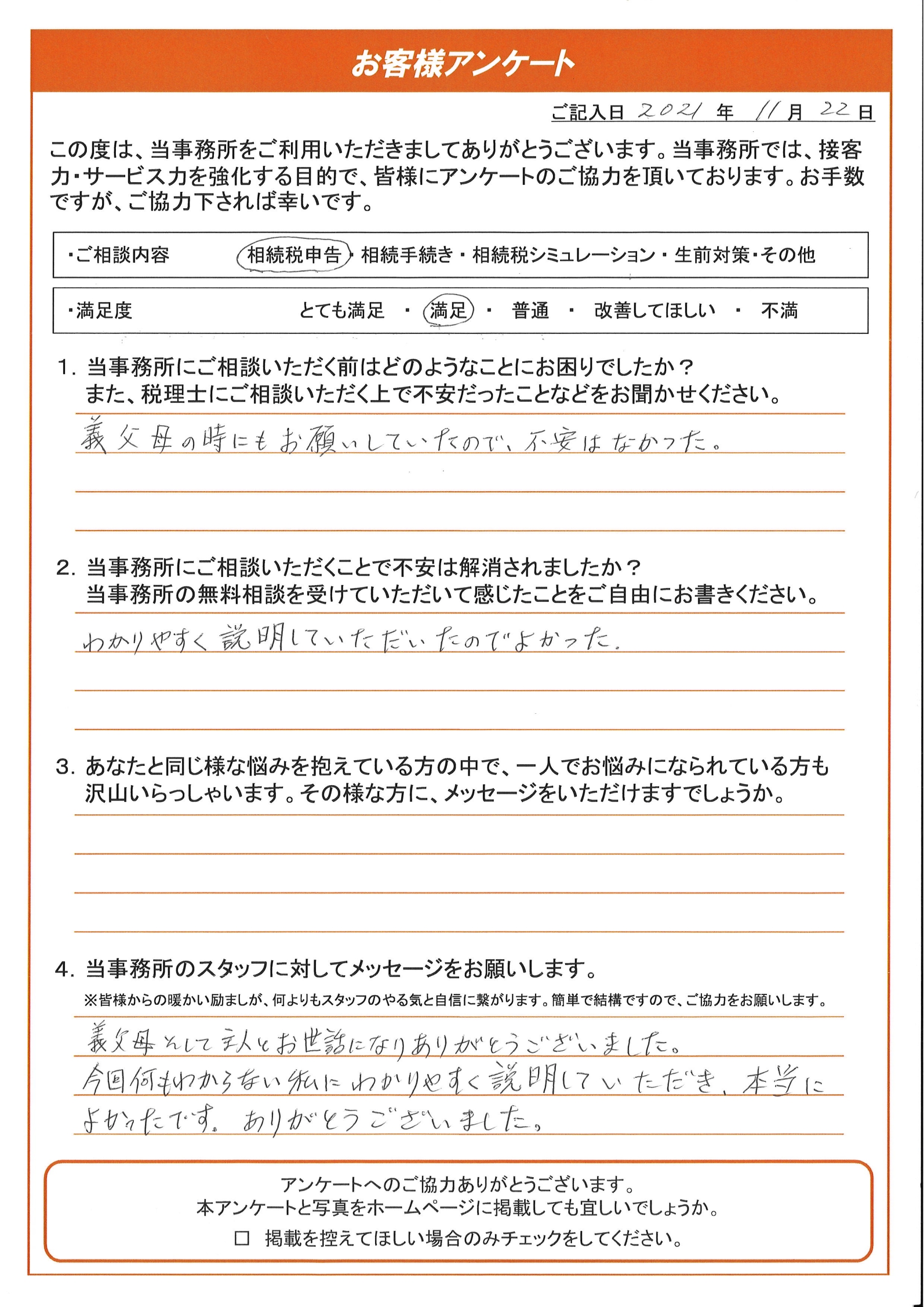 義父母、そして主人とお世話になり、ありがとうございました。今回何もわからない私にわかりやすく説明していただき、本当によかったです。ありがとうございました。