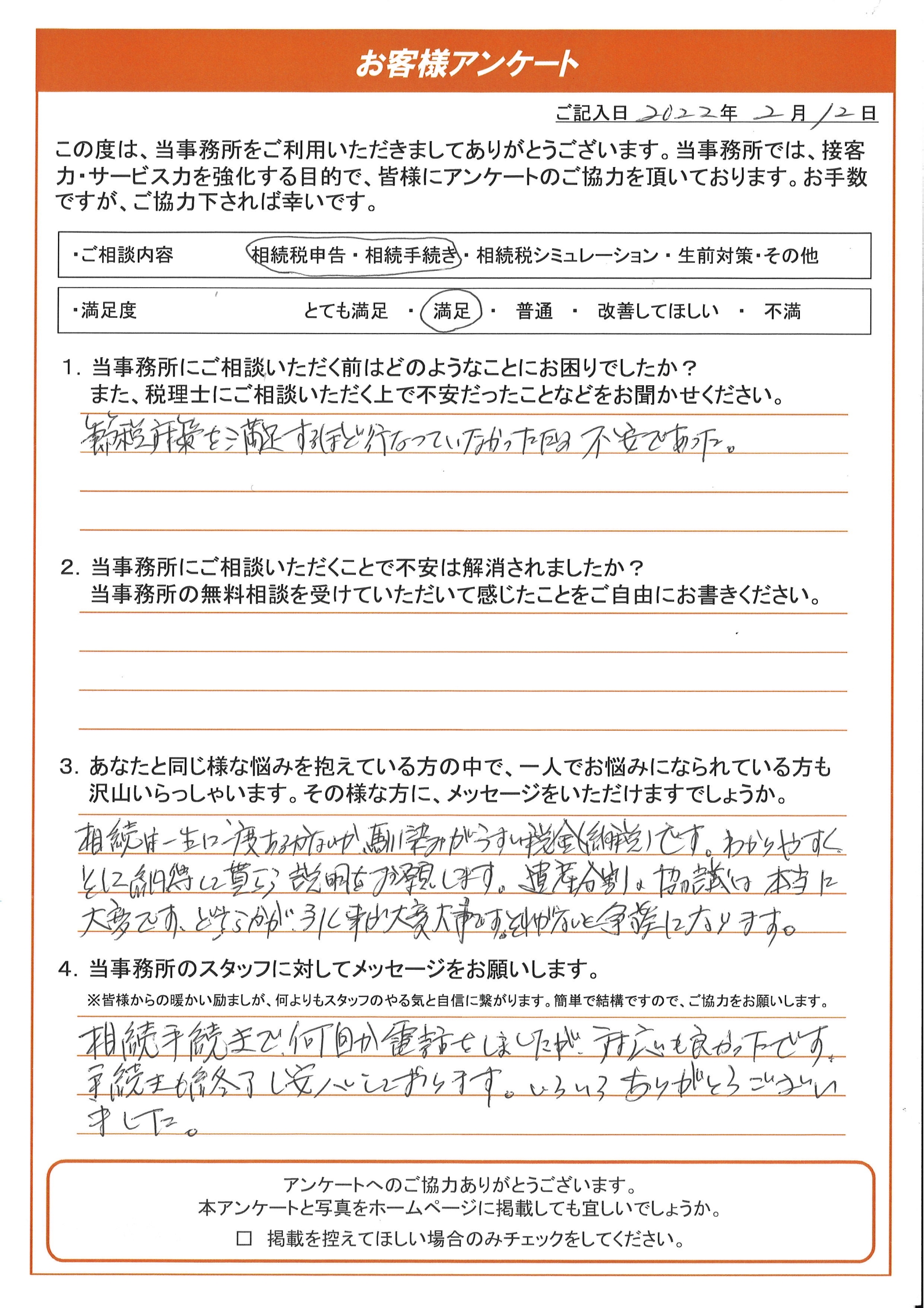 相続手続きで何回か電話をしましたが、対応も良かったです。手続きも終了し安心しております。いろいろありがとうございました。