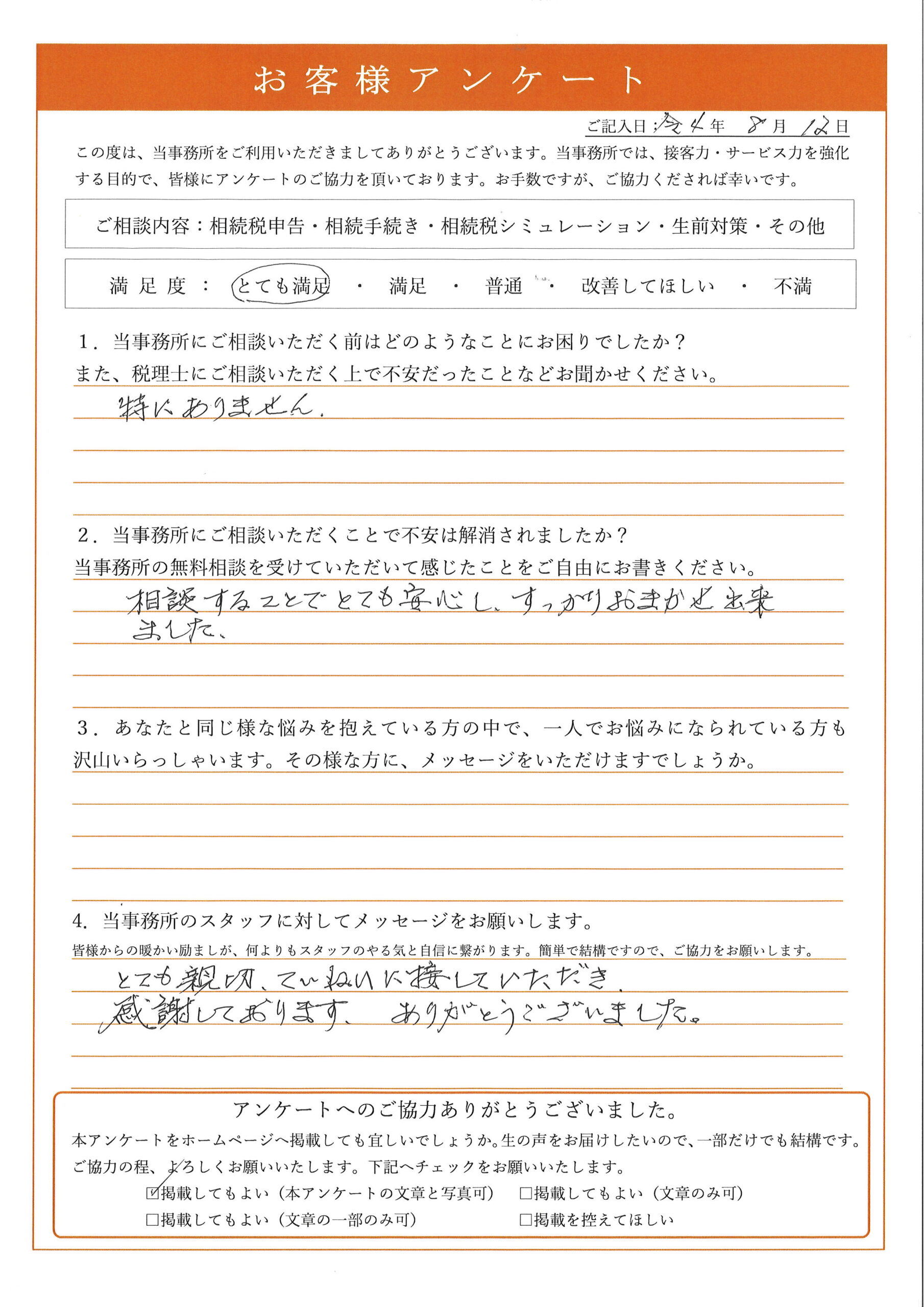 とても親切、ていねいに接していただき、感謝しております。ありがとうございました。